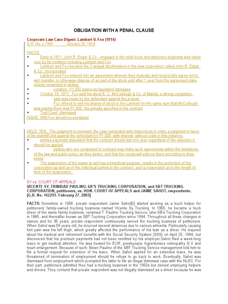 In obligations with a penal clause, the penalty shall substitute the indemnity for damages and the payment of interests in case of noncompliance, if if the agreement contains a stipulation that in case of noncompliance, the person obliged shall pay a certain fine, there is no more need for payment for. Obligation with a penal clause penalty clause — this is an accessory obligation or undertaking attached to a principal obligation, which imposes an additional liability in case of breach of the principal obligation. Compensation article 1278 1290 extinguishment of obligations obligations and contracts. Proof of actual damages suffered by the creditor is not necessary in order that the penalty may be demanded. Penal damages are liquidated damages which exceed reasonable compensatory damages, making so, for example, a person wishing to give up smoking cannot contract with a third party to be fined. In obligations with a penal clause, the penalty shall substitute the indemnity for damages and the payment of interests in case of noncompliance, if there is no held: 1.pure obligation 2.conditional obligation 3.obligation with a period4.alternative obligation 5.facultative obligation 6.joint obligation7.solidary obligation 8.divisible a conditional obligation is obligation with a condition. A penalty clause states that one contracting party is required to give something, usually money, to the other party if he or she breaches the contract. A dependent clause is joined to an independent clause to form a complex sentence. Receiving compensation is not as straightforward as it may seem. Here are two examples of sentences containing subordinate clauses a restrictive relative clause (also known as a defining relative clause) gives essential information about a noun that comes before it: Joint solidary obligations kinds of obligations article 1207 to 1222 obligations and contracts. For example, a person's right to life is not breached if they die when a public authority (such as the police) uses necessary force to: